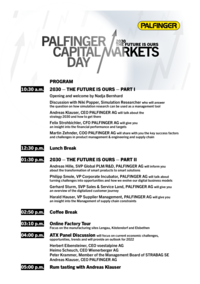On 5 November 2021, PALFINGER AG held its ninth Capital Markets Day at the Marx Studio in Vienna. Around 60 guests from the capital market environment attended this event in person or virtually. The motto of the event was "2030 - The Future is ours". The program focused on the vision and strategy of PALFINGER AG 2030, on which CEO Andreas Klauser, CFO Felix Strohbichler and COO Martin Zehnder provided insights. In the afternoon, Member of the top management from PALFINGER went into depth with regard to the operational implementation to achieve the 2030 target and talked about smart solutions, digital business models and opportunities and challenges. The digital customer journey as well as supply chain bottlenecks and limitations were also addressed. The slides of PALFINGER's management on the Capital Markets Day and the Vision and Strategy 2030 can be downloaded here.